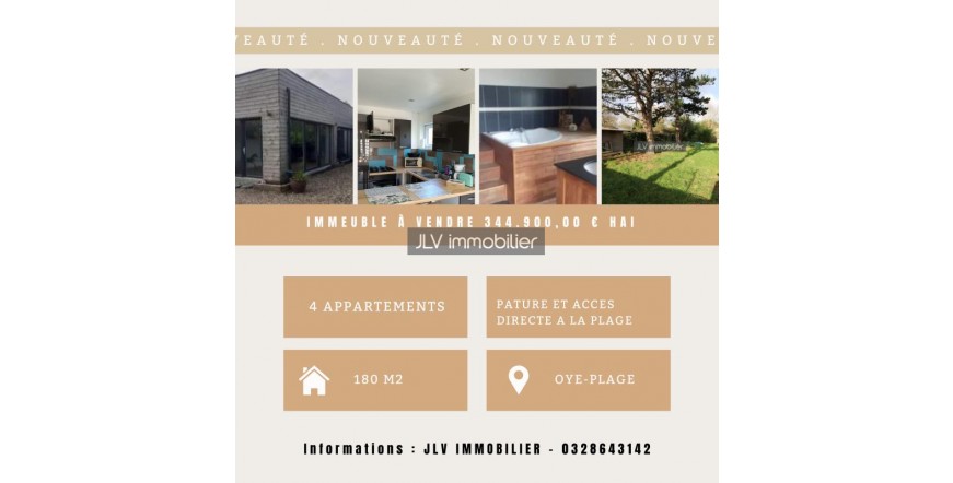 À vendre : Immeuble d'exception avec accès direct à la plage Découvrez cet immeuble entièrement rénové il y a 10 ans, offrant un cadre de vie unique avec accès direct à la plage, idéal pour les amoureux de la mer et des activités en plein air. Caractéristiques de l'immeuble : Quatre appartements de plain-pied avec jardins privatifs, parfaits pour profiter des journées ensoleillées. Pâture de 6000 m² avec boxes, idéale pour les passionnés d'équitation, avec un accès direct à la plage pour des balades à cheval inoubliables. Détails des appartements : 1er Appartement meublé de 26 m² (F2) : Libre d'occupation, possibilité de location RBN ou saisonnière. 2e Appartement de 30 m² : Loué avec bail meublé d'une durée d'un an, loyer de 550 euros. 3e Appartement de 23 m² : Loué avec bail meublé d'un an, loyer de 550 euros. 4e Appartement de 105 m² (Type F3) : Avec sauna et jacuzzi, loyer de 1000 euros (bail meublé d'un an), possibilité de récupérer le logement. Opportunité unique pour un investissement locatif ou pour vivre dans un cadre idyllique tout en bénéficiant de revenus locatifs. Ne laissez pas passer cette chance de posséder un bien d'exception au bord de la mer ! Pour plus d'informations ou pour organiser une visite, n'hésitez pas à nous contacter. Les coûts sont estimés en fonction des caractéristiques de votre logement et pour une utilisation standard sur 5 usages (chauffage, eau chaude sanitaire, climatisation, éclairage, auxiliaires) voir p.3 pour voir les détails par poste. Estimation des coûts annuels d’énergie du logement entre 2850€ et 3910€ par an Prix moyens des énergies indexés sur les années 2021, 2022, 2023 (abonnements compris) Les informations sur les risques liés à ce bien est exposé sont disponibles sur le site Géorisques : www.georisques.gouv.fr Dont 4,52 % TTC d'honoraires à la charge de l'acquéreur inclus dans le prix affiché. 🏡 JLV IMMOBILIER : Votre partenaire de confiance pour tous vos projets immobiliers ! Achat, vente, location, gestion ou expertise : quel que soit votre projet, notre équipe d’experts vous accompagne avec professionnalisme et écoute. Forts de 20 ans d’expérience et de plus de 1500 biens vendus, nous mettons notre connaissance approfondie du marché à votre service pour concrétiser vos ambitions immobilières. Pourquoi nous choisir ? ✅ Expertise reconnue : une équipe de négociateurs expérimentés, à l’écoute de vos besoins. ✅ Services complets : vente, location, gestion locative, expertise pour tous types de biens (appartements, maisons, terrains, fonds de commerce, stationnements…). ✅ Estimations gratuites et sans engagement : évaluez votre bien en toute sérénité. ✅ Deux agences à votre service : à Saint-Pol-sur-Mer (Dunkerque) et à Gravelines, pour un accompagnement de proximité. 📍 Nos agences : Saint-Pol-sur-Mer : 16 Rue de la République, 59430 Dunkerque Gravelines : 7 Rue de la République & 1 Rue Léon Blum, 59820 Gravelines 📞 Un seul numéro pour nous joindre : 03 28 64 31 42 🌐 Plus d’infos et de photos sur www.jlv-immobilier.fr Horaires d’ouverture : Lundi au vendredi : 9h-12h / 14h-18h00 Samedi : 9h00-12h JLV Immobilier, c’est l’assurance d’un accompagnement personnalisé et serein pour tous vos projets immobiliers. Contactez-nous dès aujourd’hui !